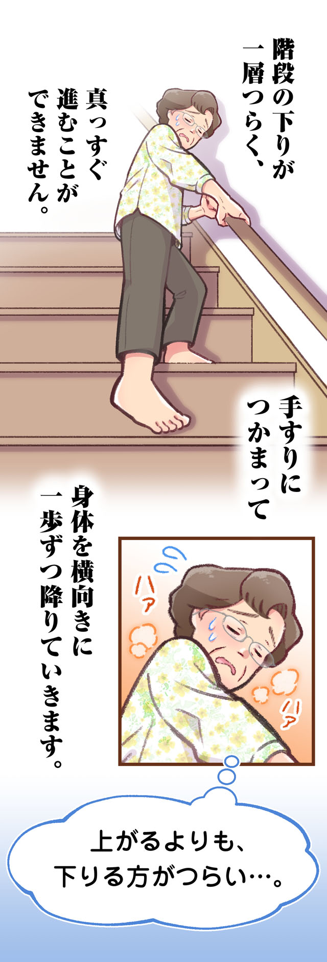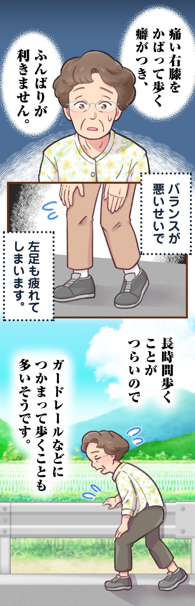 歩行、階段、正座、立ち座りなど当たり前に出来ていたことが出来なくなってしまうかもしれません。